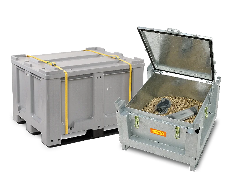 - Stahl (feuerverzinkt): besonders robust, umlaufende Gummidichtung gegen Feuchtigkeit, stabile Verschlussschnallen, unterfahrbar/stapelbar/kranbar – ideal für kritische oder beschädigte Akkus