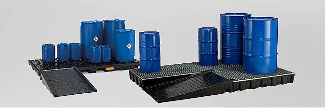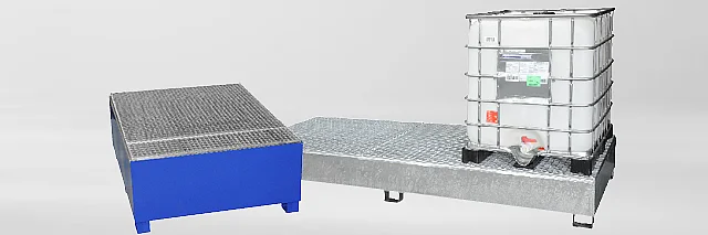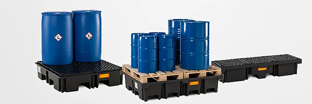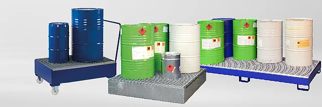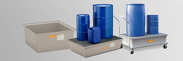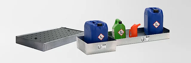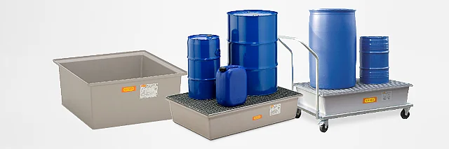 Auffangwannen von CEMO. Sichere und gesetzeskonforme Lagerung von Gefahrstoffen.