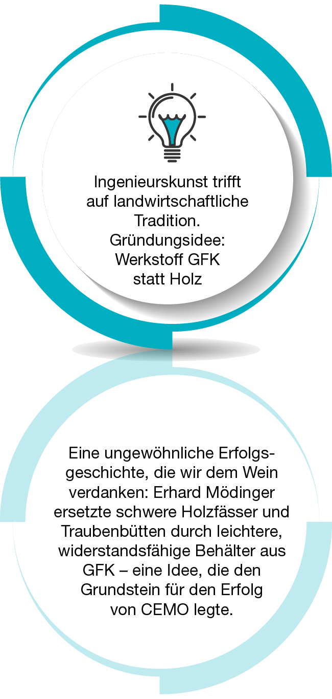 Mit Traubenbütten und Fässern aus glasfaserverstärktem Kunststoff (GFK) begann die Erfolgsgeschichte der Firma CEMO: In Weinstadt, einer Wein-Region in Baden-Württemberg, hatte Erhard Mödinger die Idee, die Holzfässer, in denen Winzer und Landwirte Flüssigkeiten lagerten und transportierten, durch leichtere und widerstandsfähigere Behälter aus GFK zu ersetzen. Anfänglich ein Zwei-Mann-Betrieb, war das Unternehmen mit dem damaligen Namen CHEMO in Weinstadt und Umgebung schnell bekannt und erfolgreich.