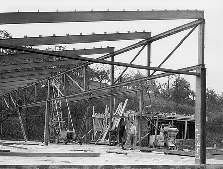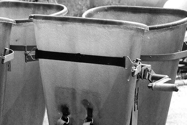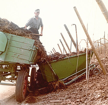 Rationeller Traubentransport vom Weinstock bis zur Kelter bedeuteten die Entwicklungen auf dem weinbau-Geräteprogramm, wie z.B Muli, Traubenwagen und Kippanlage.